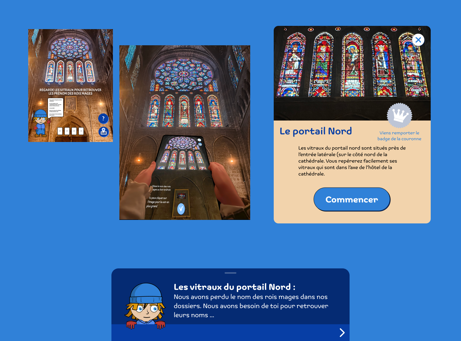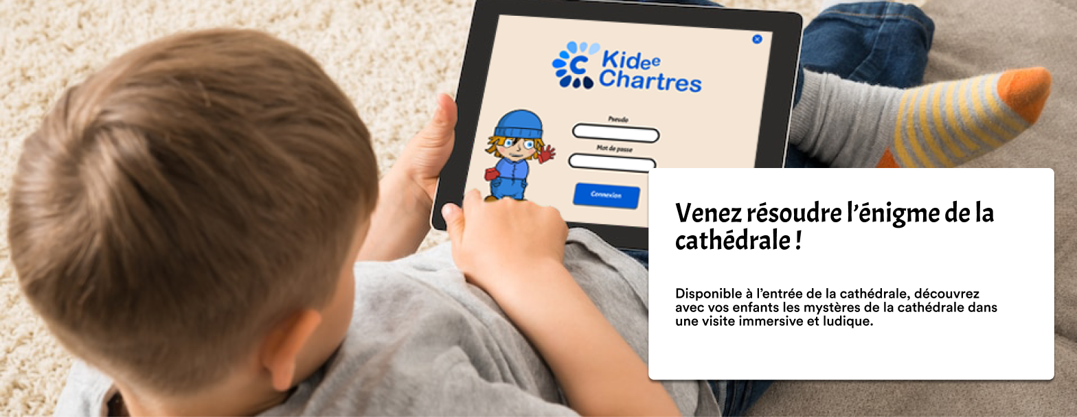 La cathédrale de Chartres est un des monuments les plus visités de France. Son influence économique sur sa ville est essentielle et il est primordial de préserver, voire réaffirmer son influence. Des recherches UX nous ont appris que la demande en application de visite guidée s'était faite ressentir et que le public cible devait être étonnement jeune. Nous avons conçu Kidee, une application de jeux ludiques et d'apprentissage, destinée principalement pour les enfants de 6à 11 ans mais conçue pour que le parcour se fasse en famille. Nous souhaitions occuper les enfants pour faciliter la visite des parents, augmenter l'intérêt et la concentration des enfants dans la découverte du lieu, tout en laissant à la cathédrale la place d'honneur. Kidee propose donc aux enfants, à travers un parcour retraçant les points essentiels de la visite, de guider toute la famille à travers les secrets du monuments.