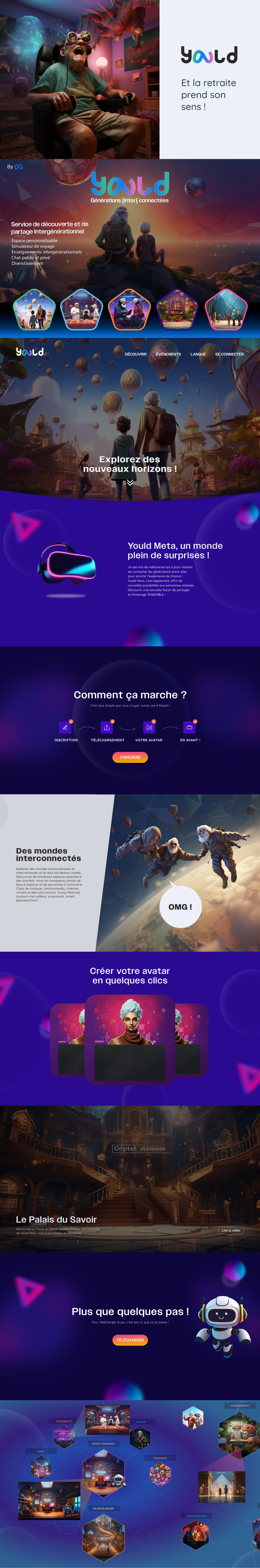 We responded to the following brief: "how to improve the lives of seniors?". We begun from the observation that the main issue for this age group was isolation. In addition to this, we also found that the telephone assistance services (e.g., S.O.S Friendship, etc.) were all operated by seniors. We know they have time, we assume people want to be able to to prove they are still part of the society. Why don't we create places were elder people can provide help and advices to younger, as it was a common thing int the past ? Therefore, we created Yould, a virtual reality space dedicated to {re}connect generations.